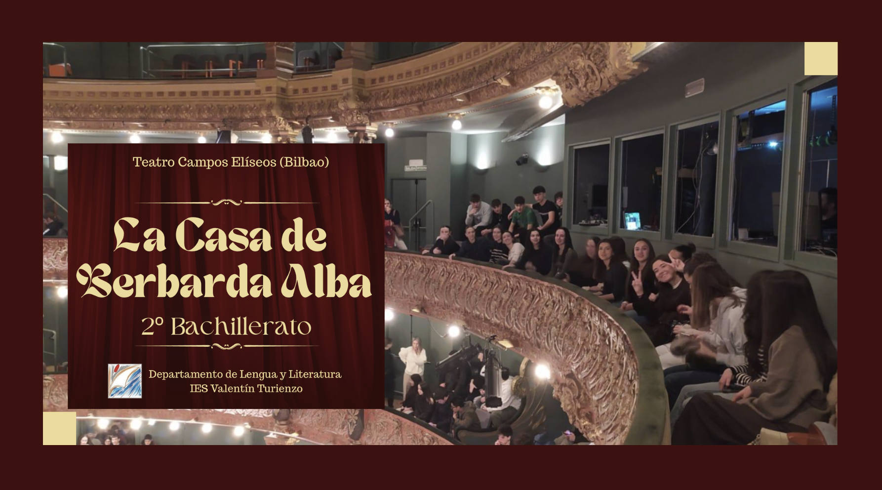 Hoy, 21 de enero, el alumnado de 2º de Bachillerato ha asistido a la representación de la obra de teatro «La Casa de Bernarda Alba» de Federico García Lorca en el teatro Campos Elíseos de Bilbao, en la siguiente página tenéis más información sobre este evento https://www.transeduca.com/obra-la-casa-de-bernarda-alba-696-es