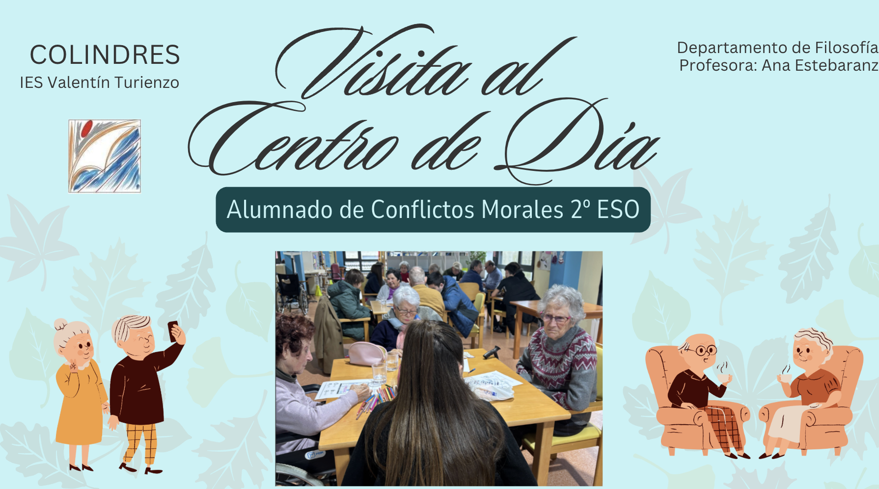 Antes de las vacaciones, el alumnado de la materia Conflictos Morales, de 2.º de la ESO, visitó el Centro de Día de Colindres que, como sabéis, colabora con nuestro instituto en numerosas actividades. En esta actividad el alumnado compartió un tiempo muy enriquecedor con las personas mayores que allí acuden. Hablaron con ellos, escucharon sus historias y pasaron el rato juntos compartiendo unos momentos estupendos, tanto para los mayores del centro como para nuestros jóvenes de 2º.