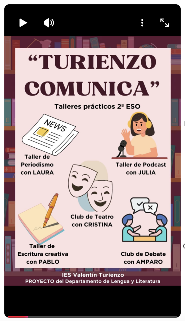 El Departamento de Lengua Castellana y Literatura ha iniciado este año el proyecto «Turienzo Comunica». Nace inspirado en el ya conocido «Turienzo Resuena», del Departamento de Música, y se está llevando a cabo en 2°ESO. Una vez a la semana los alumnos se agrupan con compañeros de otras clases y llevan a cabo una serie de talleres prácticos de forma rotatoria.
