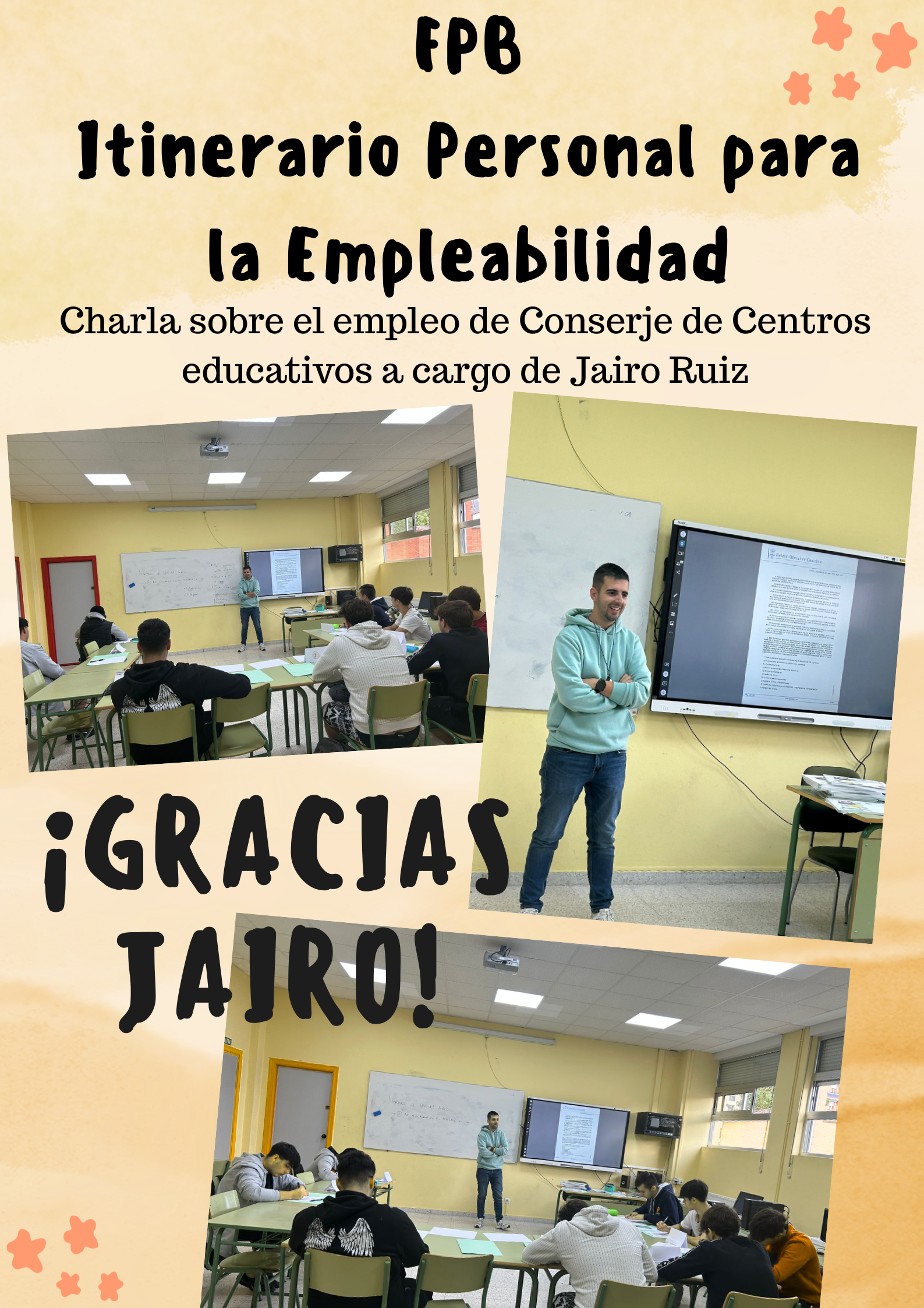 Los alumnos de FP Básica de Acceso y Conservación de Instalaciones Deportivas de la profesora Ana I. Bravo, están analizando en el módulo I. P. E. (Itinerario Personal para la Empleabilidad) las distintas ocupaciones laborales que podrían desarrollar al finalizar el ciclo de grado básico , entre las que está conserje de colegios.