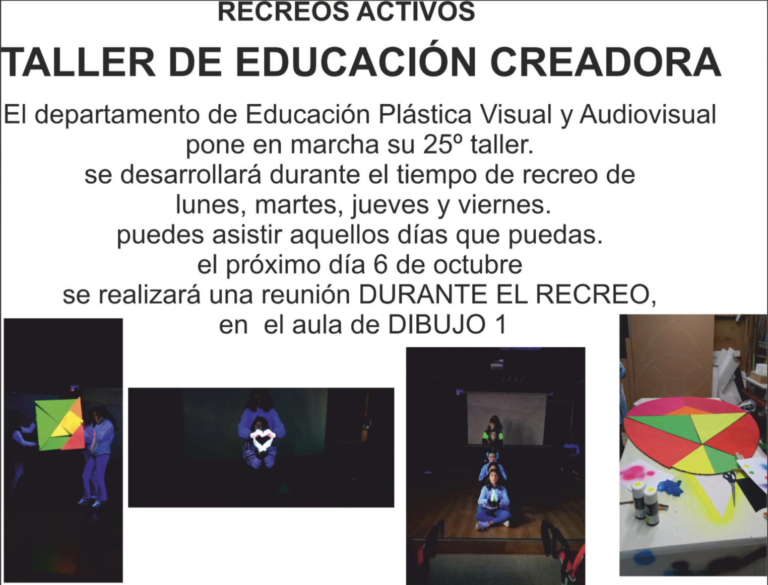 El Departamento de Educación Plástica y Visual del instituto pone en marcha su 25 taller de Educación Creadora dentro de los recreos activos. Este taller ya tiene solera, como podéis comprobar y se desarrolla durante los recreos de los lunes, martes, jueves y viernes. Los días que podáis sois bienvenidos. El taller comienza el lunes 6 de octubre en el aula de Dibujo 1.